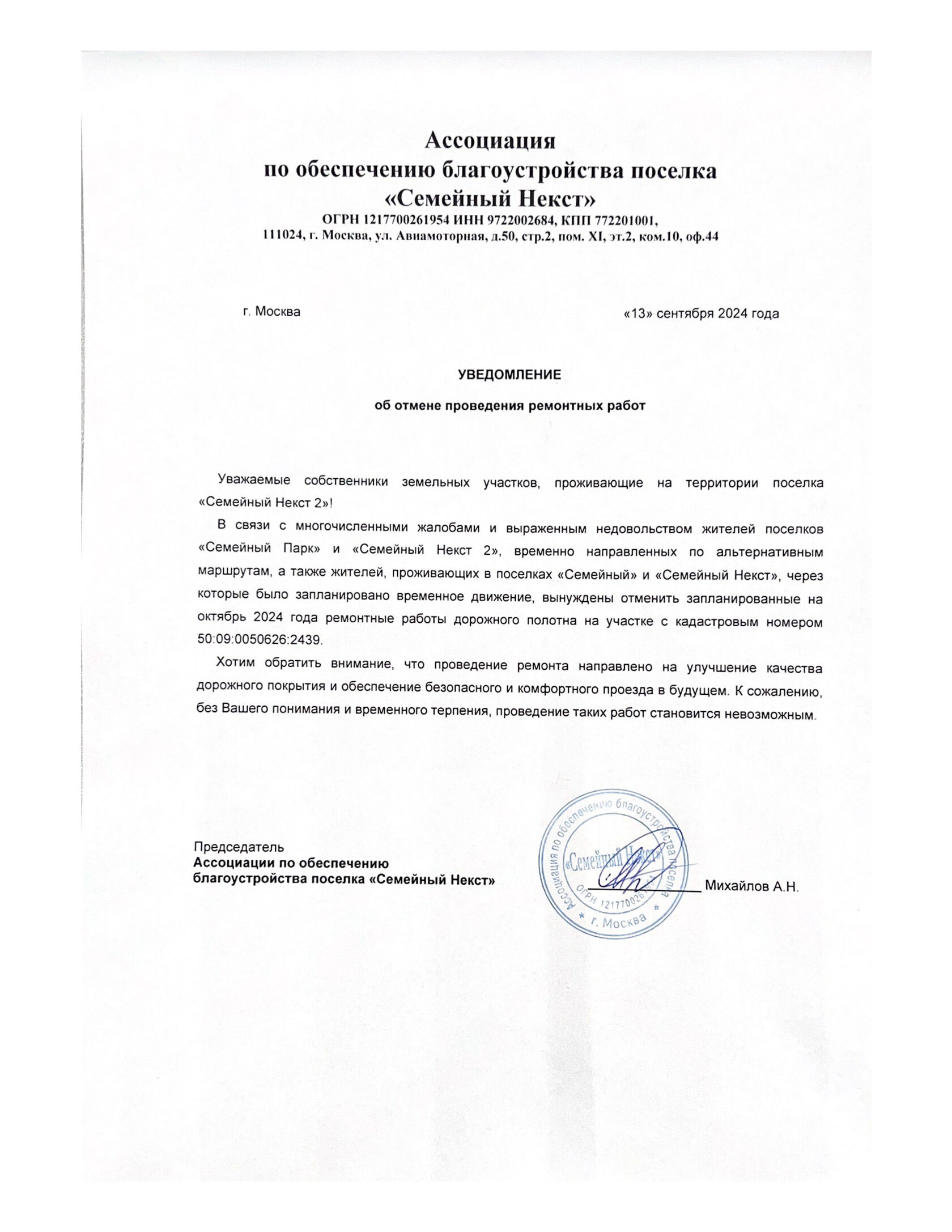 п. Семейный Некст Уведомление об отмене проведения ремонтных работ