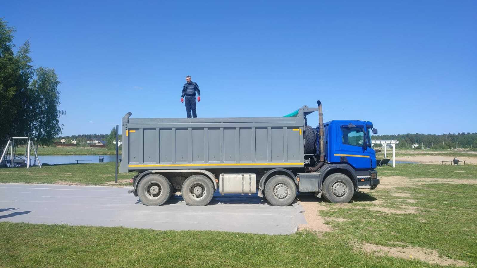 Привезли мелкий речной песок для строящейся волейбольной площадки.
